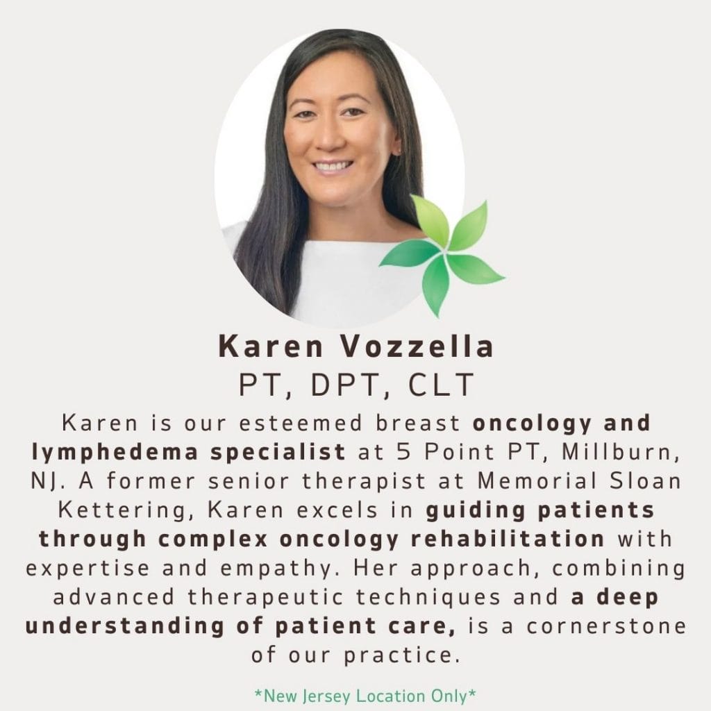 At 5 Point PT, we are dedicated to providing comprehensive and compassionate care for individuals experiencing lymphedema. Our specialist, Karen Vozzella, brings a wealth of knowledge and experience to our NJ clinic, ensuring that each patient receives the highest level of care tailored to their unique needs.